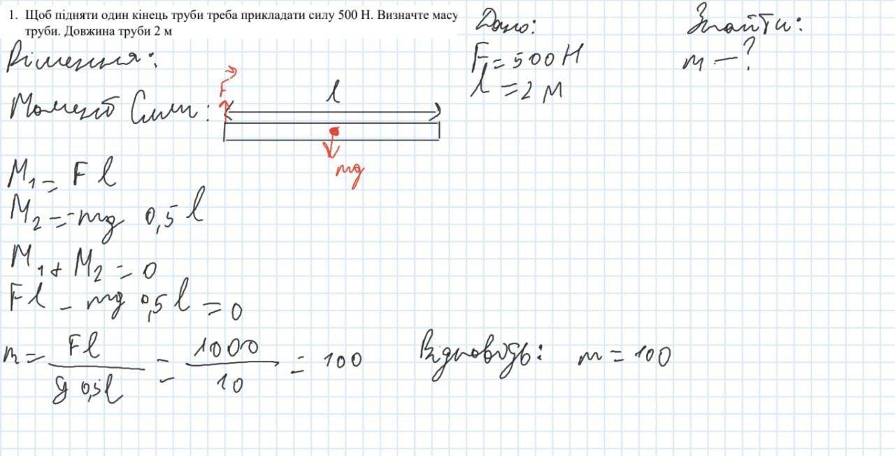 Щоб підняти один кінець труби треба прикладати силу 500 H. Визачте масу труби. Довжина труби 2м.