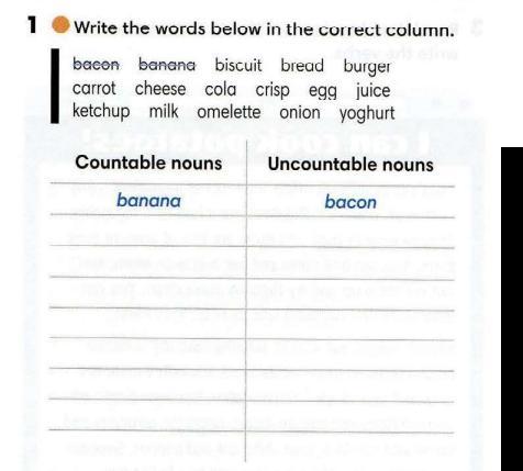 Uncountable:bread,cola,crisp,juice,ketchup,milk,omelette,yoghurt