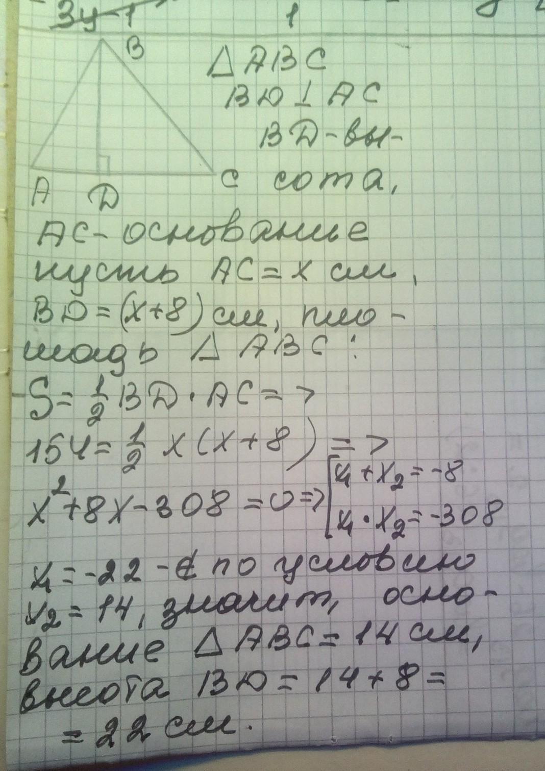 Основпние треугольника на 8 см меньше чем высота, а площадь треугольника 154 см². Вычисли основание и высоту треугольника