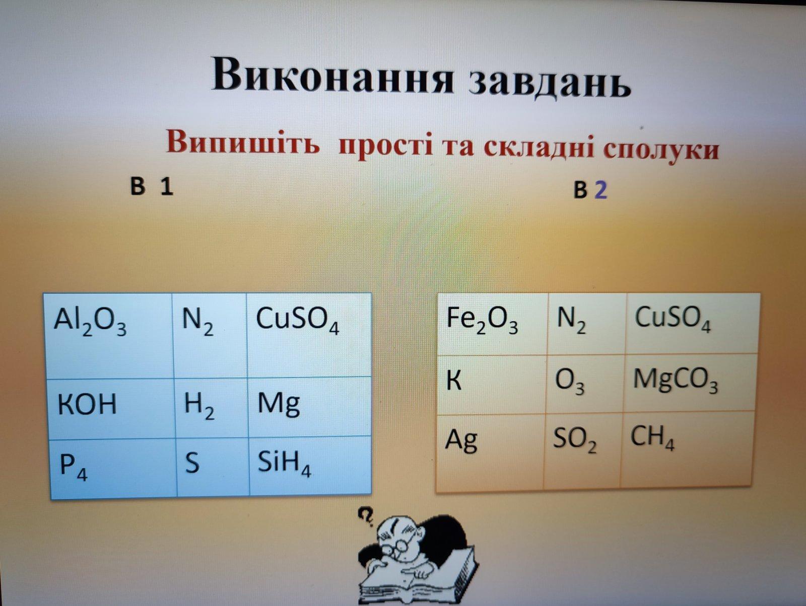 Складні сполуки: Al2O3; KOH; SiH4; CuSO4; Fe2O3; SO2; CH4; MgCO3.