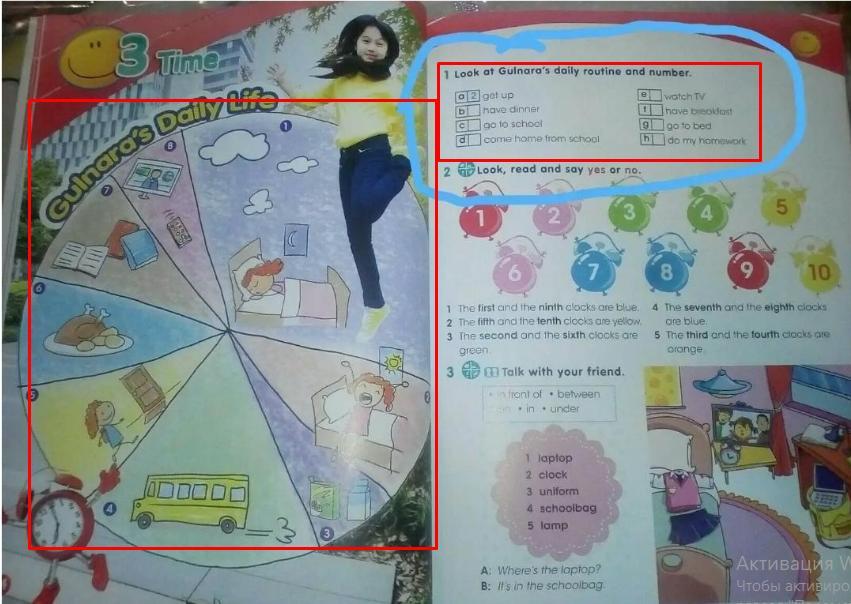 1 Look at Gulnara's daily routine and number. a 2 get up b C d have dinner go to school come home from school e f g h watch TV have breakfast go to bed do my homework