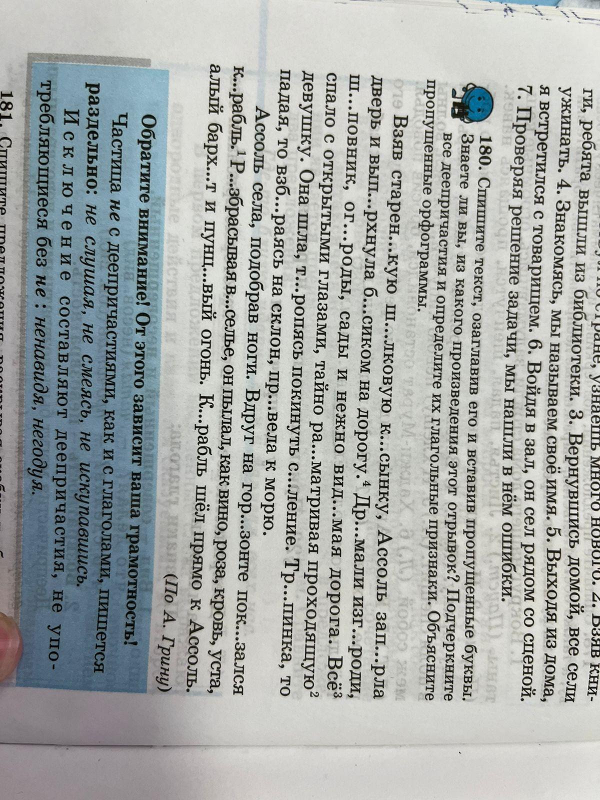 180. Спишите текст, озаглавив его и вставив пропущенные буквы. Знаете ли вы, из какого произведения этот отрывок? Подчеркните все деепричастия и определите их глагольные признаки. Объясните пропущенные орфограммы.