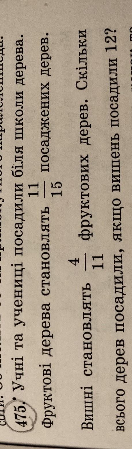 вишень посадили 12, это значит, что эти 12 деревьев, это та 4/11 вишень,то есть, если найти это число, получится числитель фруктовых деревьев
