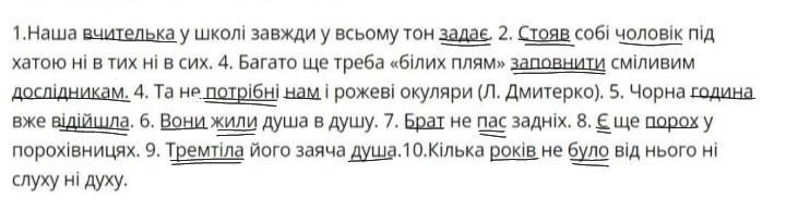 1. Наша вчителька у школі завжди у всьому тон задає. 2. Стояв собі чоловік під хатою ні в тих ні в сих. 4. Багато ще треба «білих плям» заповнити сміливим дослідникам. 4. Та не потрібні нам і рожеві окуляри (Л. Дмитерко). 5. Чорна година вже відійшла. 6. Вони жили душа в душу. 7. Брат не пас задніх. 8. Є ще порох у порохівницях. 9. Тремтіла його заяча душа. 10. Кілька років не було від нього ні слуху ні духу.