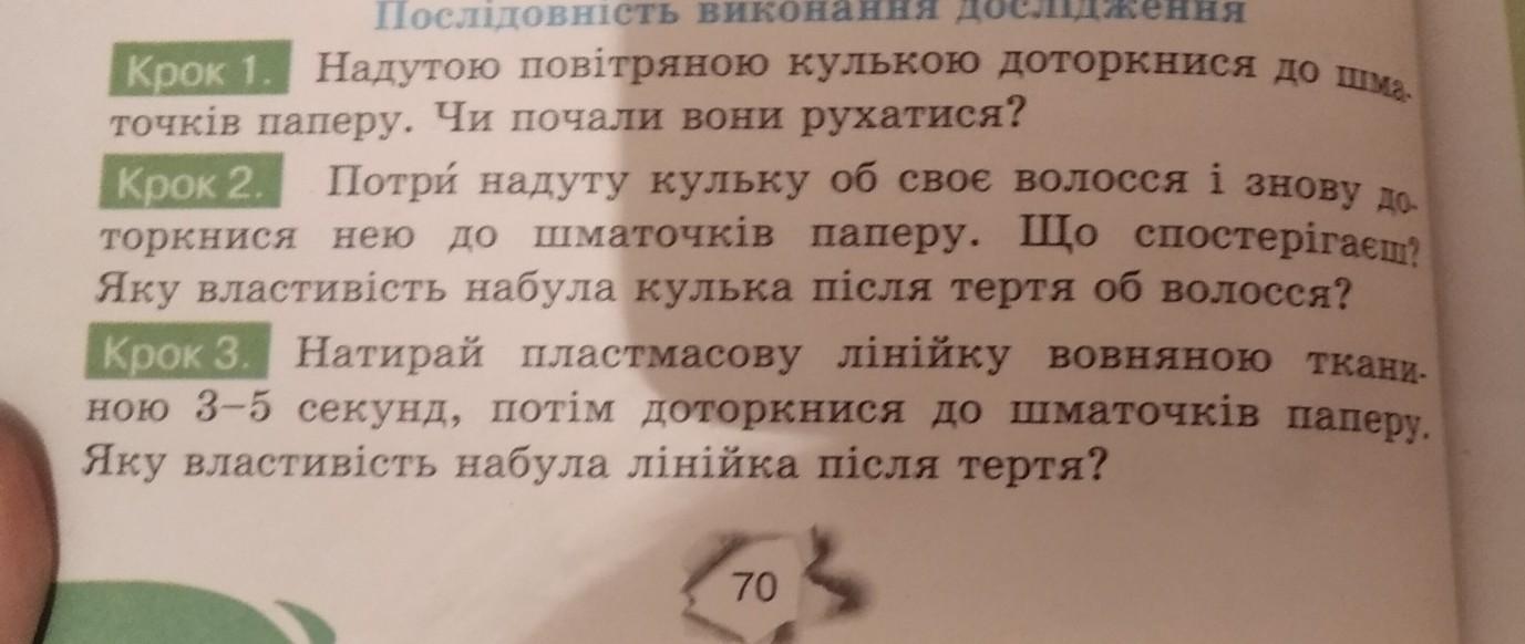 Послідовність виконання дослідження Крок 1. Надутою повітряною кулькою доторкнися до шма точків паперу. Чи почали вони рухатися? Крок 2. Потри надуту кульку об своє волосся і знову до- торкнися нею до шматочків паперу. Що спостерігаєш? Яку властивість набула кулька після тертя об волосся? Крок 3. Натирай пластмасову лінійку вовняною ткани. ною 3-5 секунд, потім доторкнися до шматочків паперу. Яку властивість набула лінійка після тертя? 70