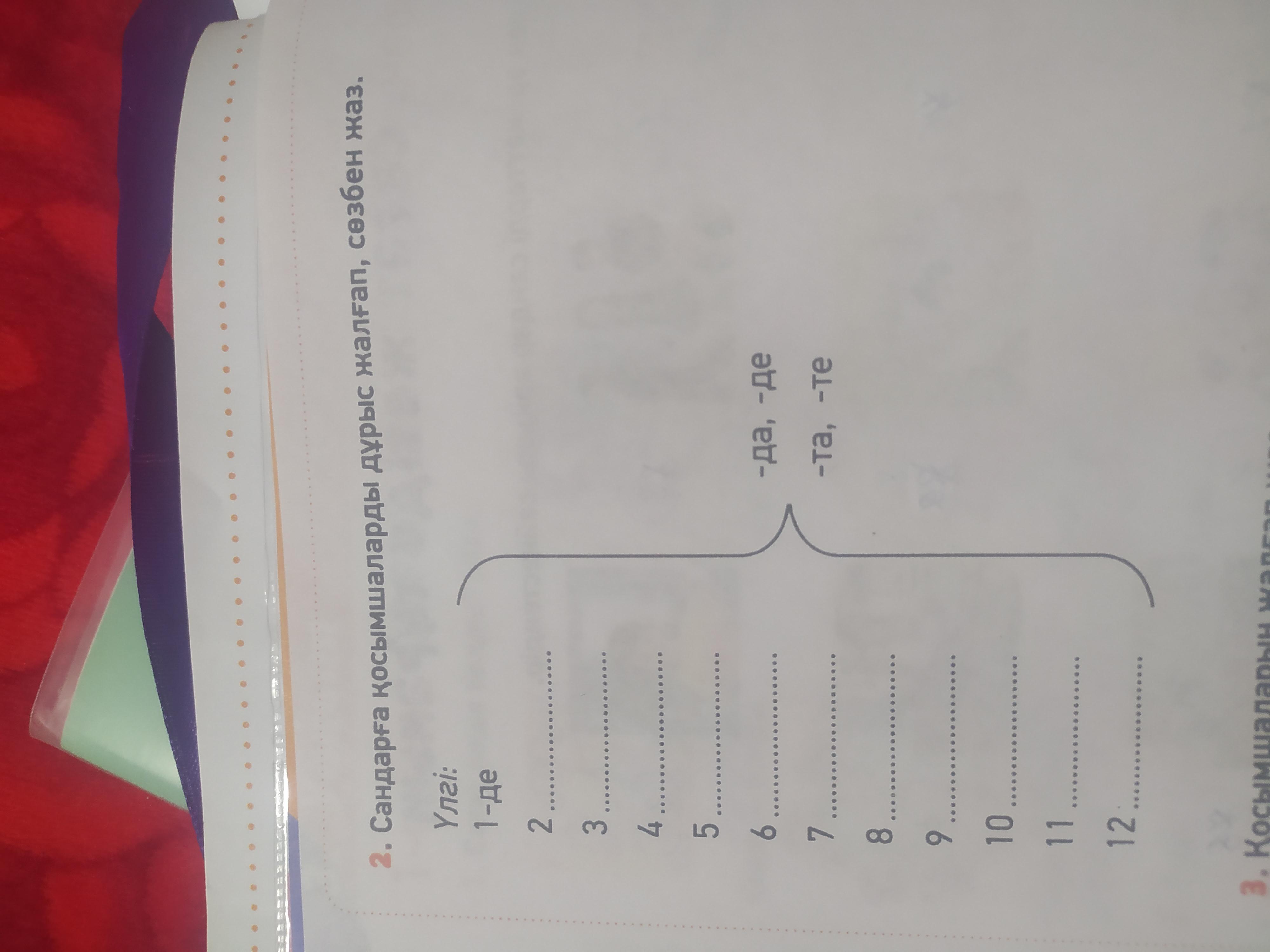 бірде,екіде,үште,төрте,бесте,алтыда,жетіде,сегізде,тоғызда,онда,он бірде,он екіде