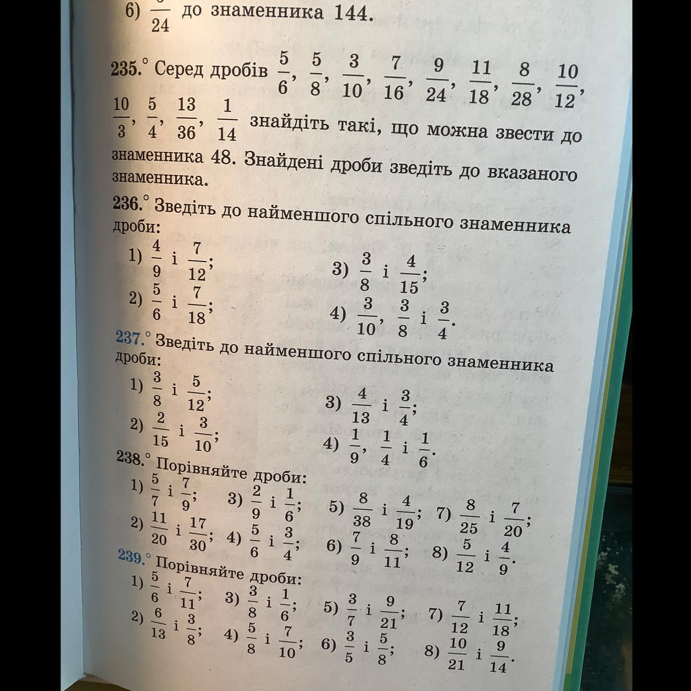 1)НСК(8; 12) = 24; 3/8=5/12;9/24=10/24; 2) НСК(15; 10)= 30; 2/15=3/10;4/30= 9/30; 3) НСК(13; 4) = 52; 4/13=3/4;16/52=39/52; 4) НСК(9;4;6)=36; 1/9=1/4=1/6; 4/36=9/36=6/36.