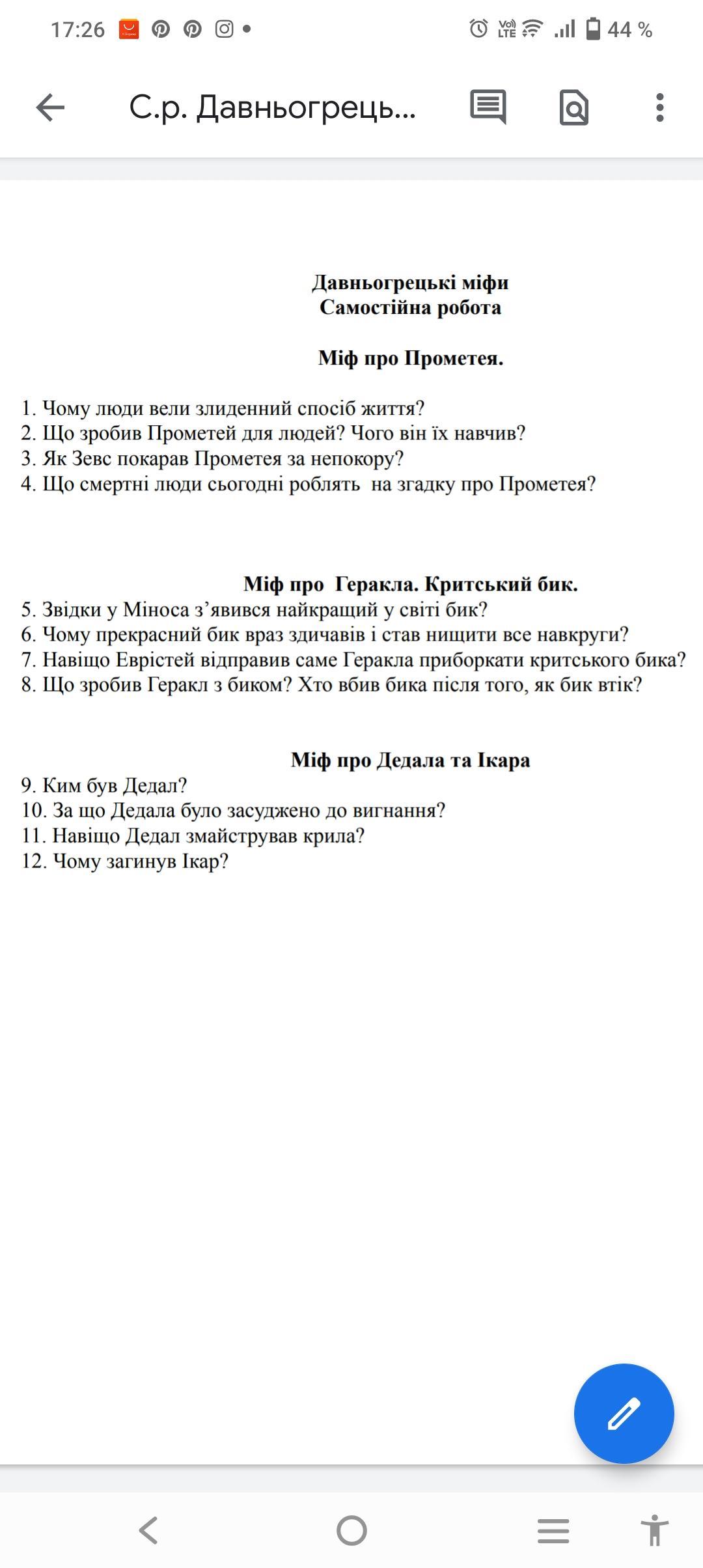 Давньогрецькі міфи Самостійна робота Міф про Прометея. 1. Чому люди вели злиденний спосіб життя? 2. Що зробив Прометей для людей? Чого він їх навчив? 3. Як Зеве покарав Прометея за непокору? 4. Що смертні люди сьогодні роблять на згадку про Прометея? Міф про Геракла. Критський бик. 5. Звідки у Міноса з'явився найкращий у світі бик? . Чому прекрасний бик враз здичавів і став нищити все навкруги? 6 7. Навіщо Еврістей відправив саме Геракла приборкати критського бика? 8. Що зробив Геракл з биком? Хто вбив бика після того, як бик втік Міф про Дедала та Ікара 9. Ким був Дедал 10. За що Дедала було засуджено до вигнання? 11. Навіщо Дедал змайстрував крила? 12. Чому загинув Ікар? Помогите пж