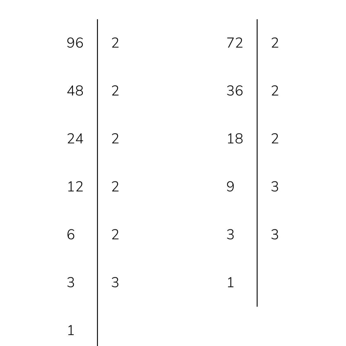 96 = 2:2:2:2:2:3; 72=2:2:2:3• 3;