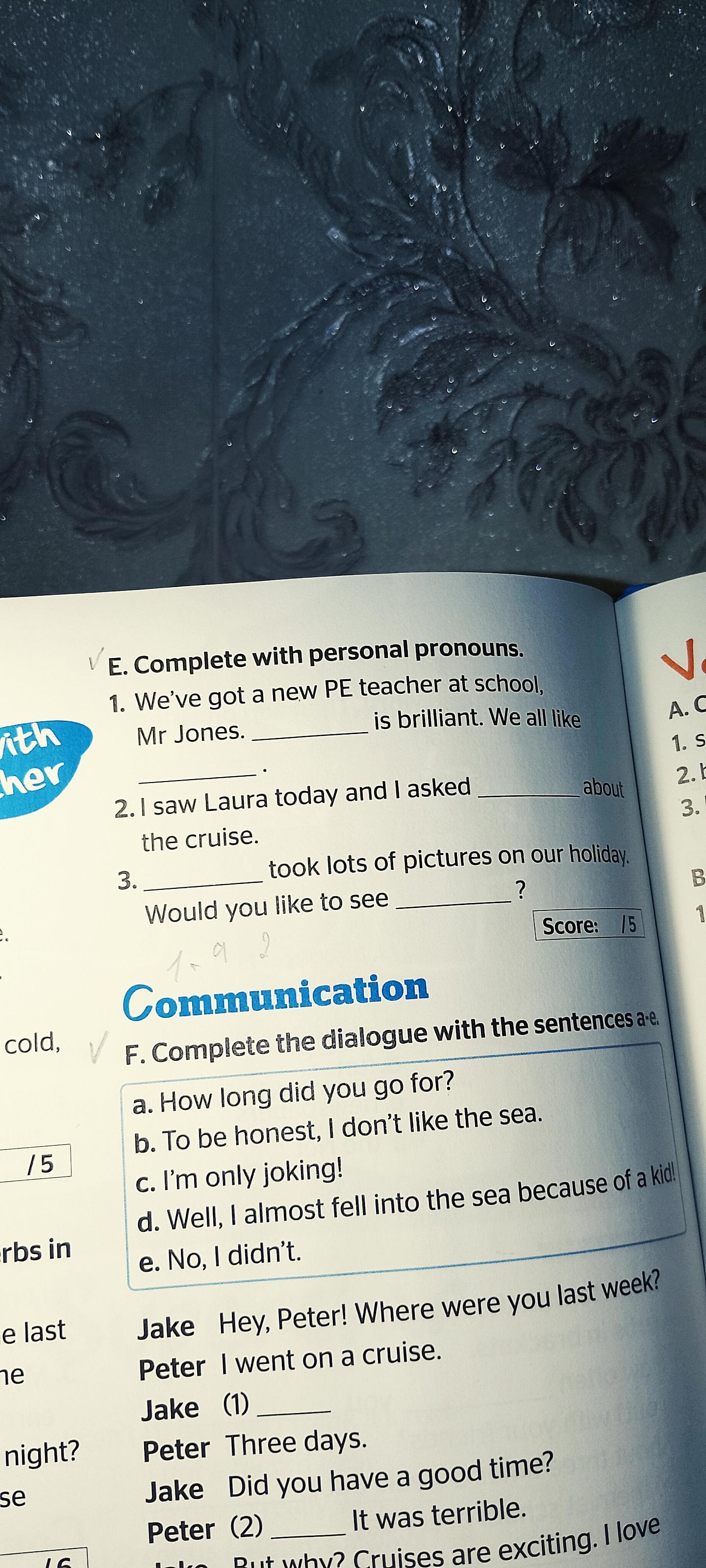 1we've got a new PE teacher at school . Mr. Jones, he is brilliant.we all like he. 2. I saw Laura today, and I asked she about the cruise .3 He took lots of pictures on our holiday. would you like to see he.