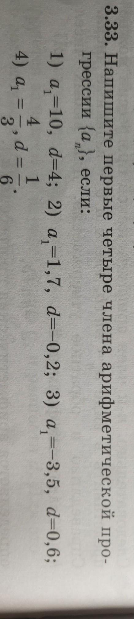 3.33. Напишите первые четыре члена арифметической про- грессии {а }, если: 1) a1=10, d=4; 2) а1=1,7, d=-0,2; 3) a,=-3,5, d=0,6; 1 4 4) a = -, d =