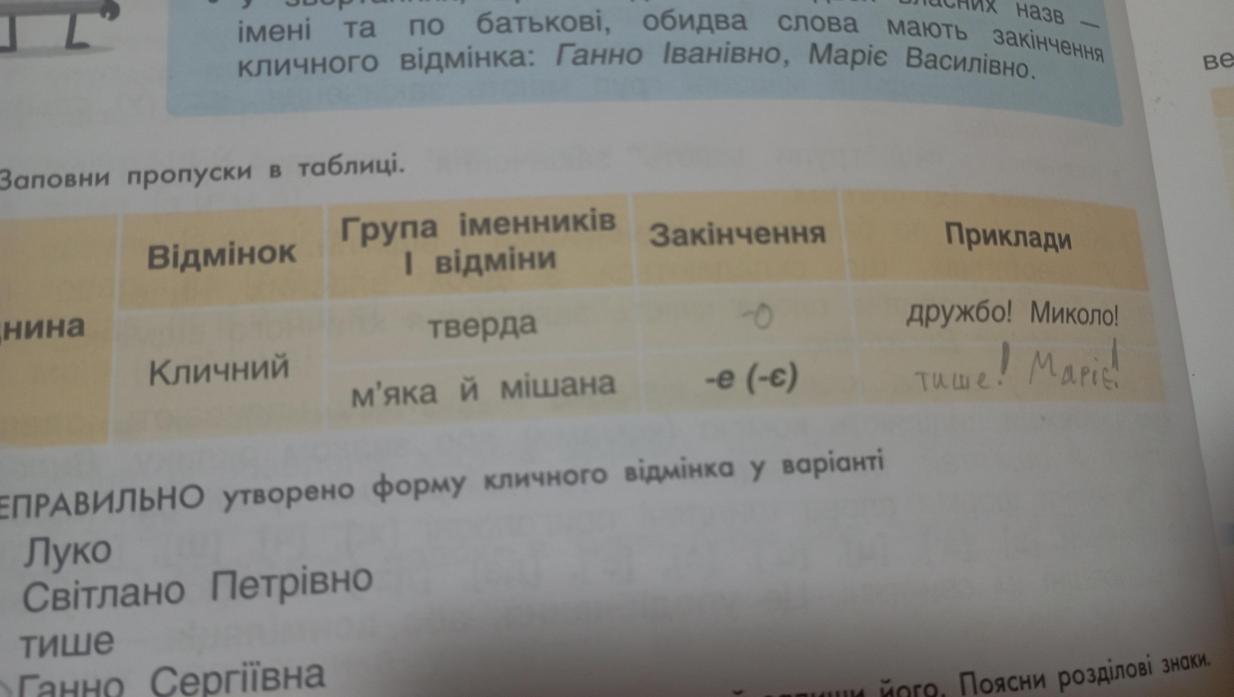 3 Заповни пропуски в таблиці. Однина Відмінок Кличний Група іменників I вiдмiни Закінчення тверда м'яка й мішана -e (-c) Приклади дружбо! Миколо!