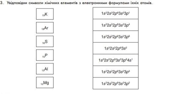 ПОМОГИТЕ ПОЖАЛУЙСТА 3. Увiдповiдни символи хімічних елементів з електронними формулами ïхніх атомів. 1s22s22p 3s23p 1s22s22p 3s23p 19K 18 Ar 16S 15P 13 Al 12 Mg 1s22s22p3s23p 1s²2s22p 3s2 1s²2s²2p 3s²3p°4s' 1s22s22p3s²3p³ 1s²2s²2p 3s²3p²