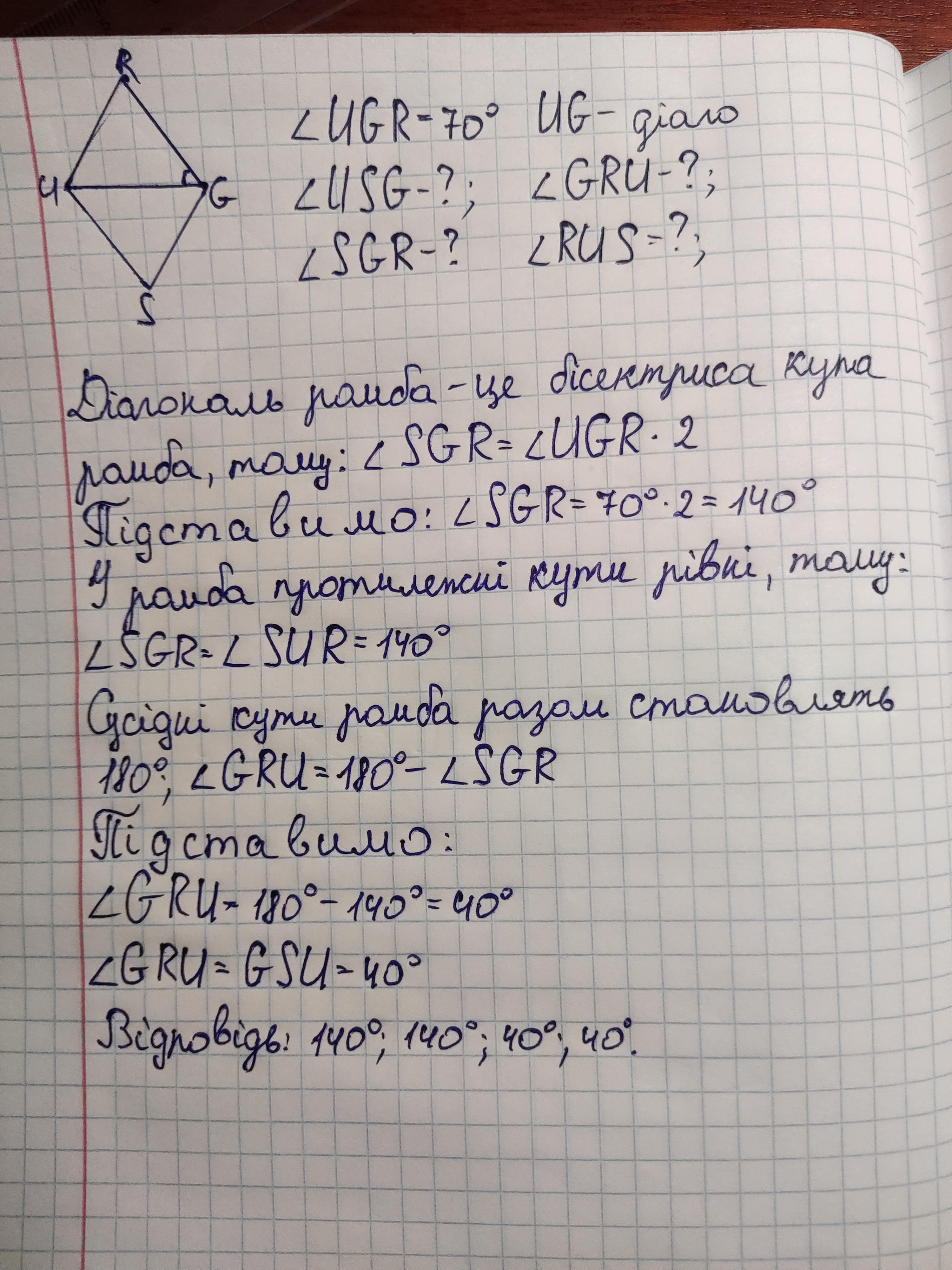 У ромба протилежні кути рівні, тому кут SGR=кут SUR=140°