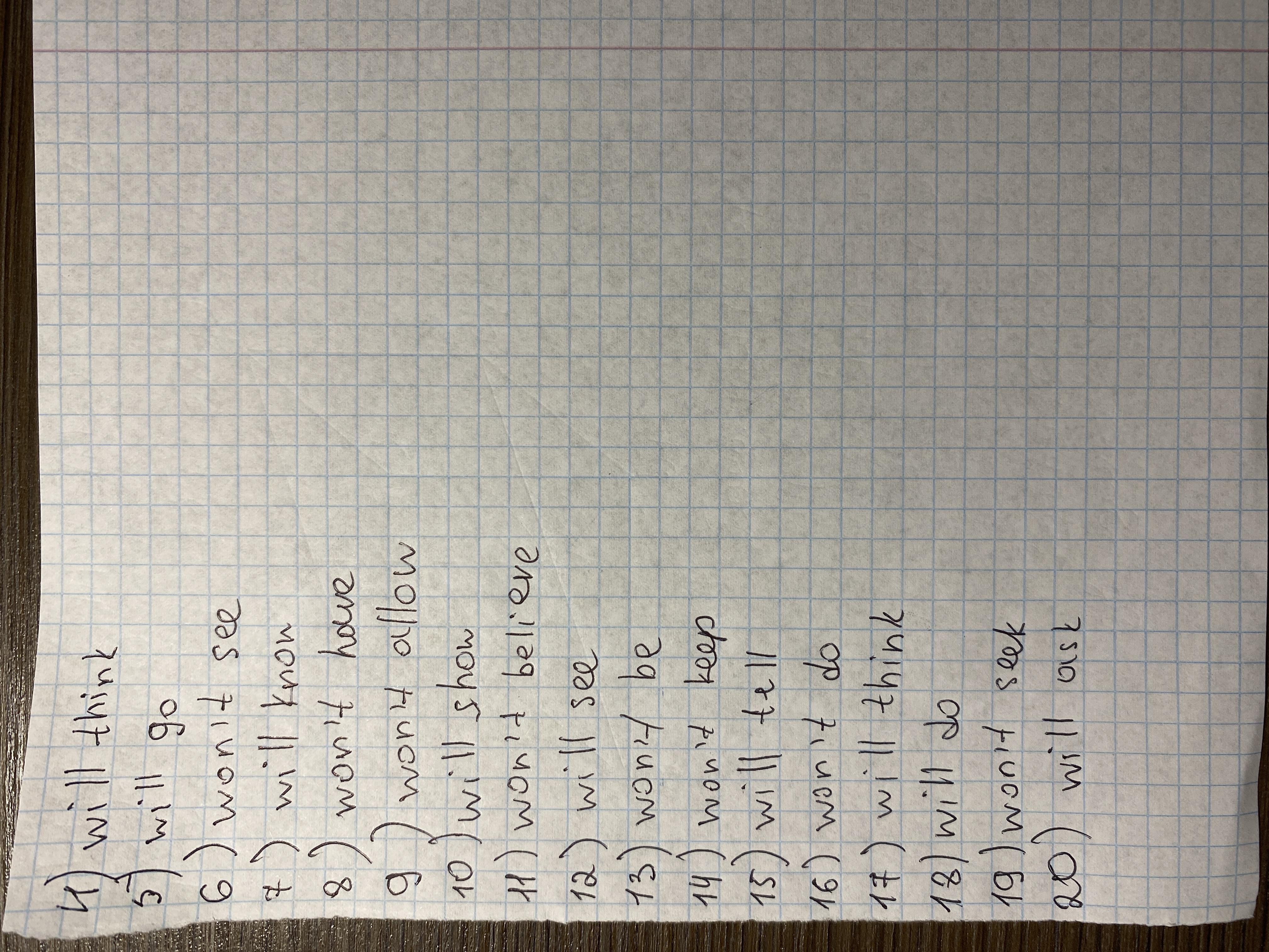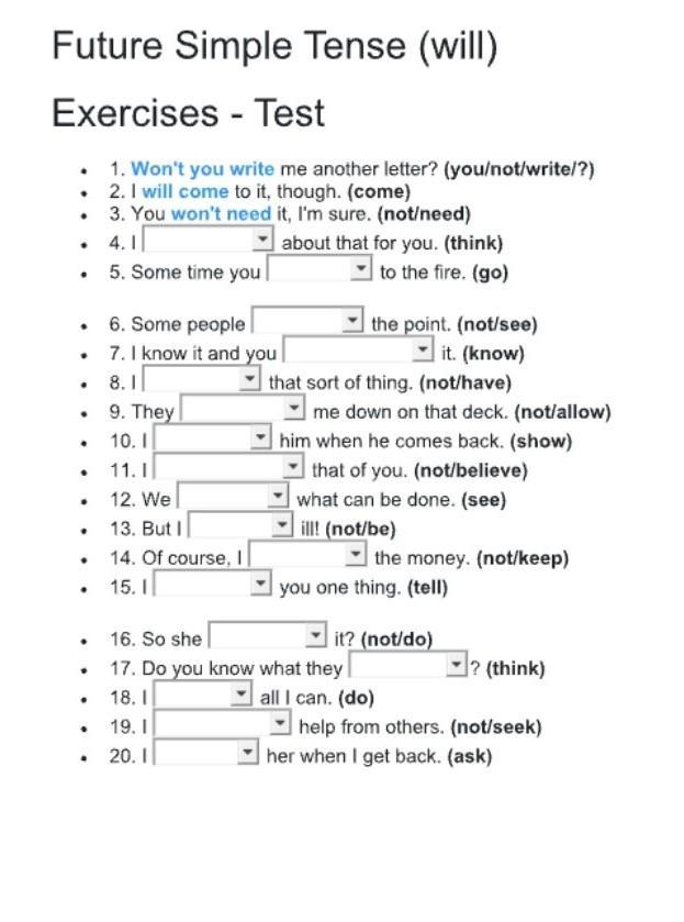 Future Simple Tense (will) Exercises - Test . . . . . . . . . ♦ . . . . . . 1. Won't you write me another letter? (you/not/write/?) 2. I will come to it, though. (come) 3. You won't need it, I'm sure. (not/need) 4.1 about that for you. (think) 5. Some time you to the fire. (go) 6. Some people 7. I know it and you 8.1 9. They 10. I 11.1 12. We 13. But I 14. Of course, I 15.1 the point. (not/see) it. (know) that sort of thing. (not/have) me down on that deck. (not/allow) him when he comes back. (show) that of you. (not/believe) what can be done. (see) ill! (not/be) the money. (not/keep) you one thing. (tell) 16. So she 17. Do you know what they 18. I 19. I 20.1 it? (not/do) all I can. (do) ? (think) help from others. (not/seek) her when I get back. (ask)