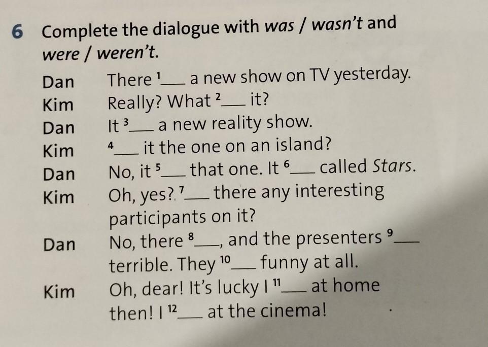 6 Complete the dialogue with was / wasn't and were / weren't. Dan Kim Dan Kim Dan Kim Dan Kim There a new show on TV yesterday. Really? What 2_____ it? It 3 4 a new reality show. it the one on an island? that one. It 6 called Stars. there any interesting No, it 5 Oh, yes? participants on it? No, there, and the presenters ⁹- terrible. They 10 funny at all. - Oh, dear! It's lucky I " at home then! I 12 at the cinema!