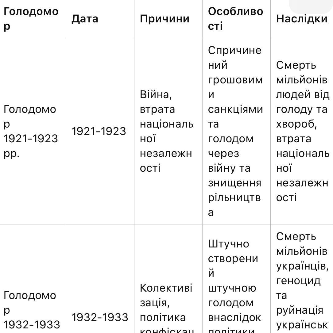 Ось порівняльна таблиця щодо голодоморів в Україні: