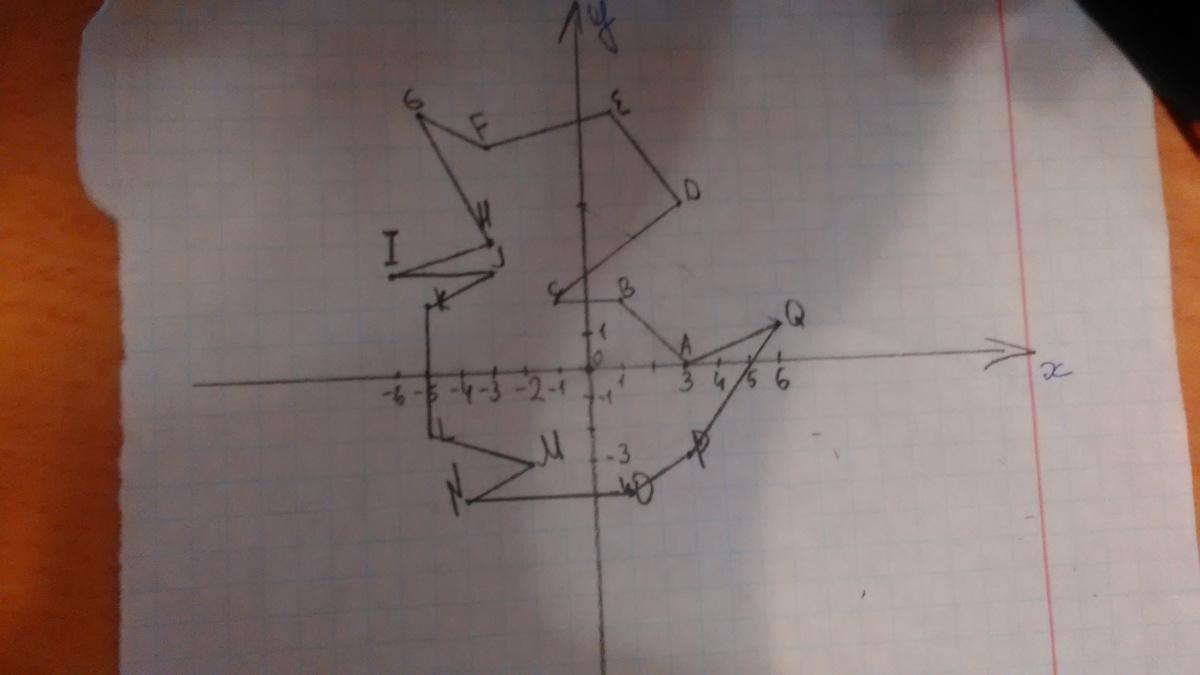 Нарисуйте схему с помощью цифр:(3,0);(1,2);(-1,2);(3,5);(1,8);(-3,7);(-5,8);(-3,4);(-6,3);(-3,3);(-5,2);(-5,-2);(-2,-3);(-4,-4);(1,-4);(3,-3);(6,1);(3,0);(-1,5) Пожалуйста , срочно очень нужно должна получиться утка на рисунке