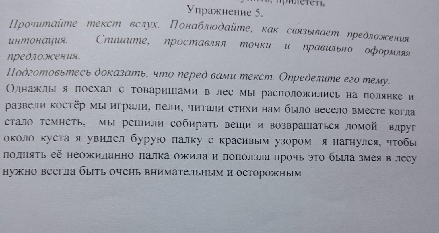 1) Однажды я поехал с товарищами в лес. Мы расположились на полянке и развели костер. Мы играли, пели, читали стихи. Нам было весело вместе. Когда стало темнеть, мы решили собирать вещи и возвращаться домой. Вдруг, около куста, я увидел бурую палку с красивым узором. Я нагнулся, чтобы поднять ее. Неожиданно палка ожила и поползла прочь. Это была змея. В лесу нужно всегда быть очень внимательным и осторожным.