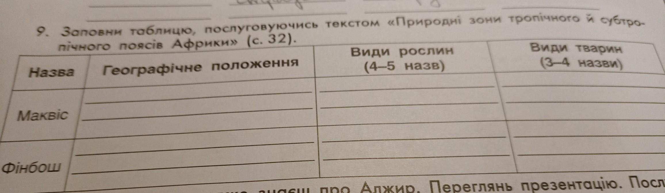 маквіс географічне положення СХИЛ ГІР АТЛАС види рослин МИРТ, ЯЛІВЕЦЬ, СОСНА ПІНІЯ, ОЛИВКОВЕ ДЕРЕВО види тварин ЛАСКА, ШАКАЛ, ГІЄНА, ПЕРСЬКА МАВПА, АЛЖИРСЬКА ЛИСИЦЯ