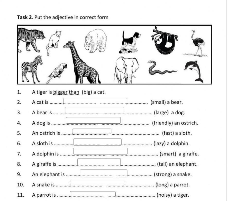 Task 2. Put the adjective in correct form 1. 2. 3. 4. 5. 6. 7. 8. 9. 10. 11. A tiger is bigger than (big) a cat. A cat is A bear is A dog is An ostrich is A sloth is A dolphin is A giraffe is An elephant is A snake is.......... A parrot is ..…........ ********* ****** ********** ******** ******* ****** ... ************** ***** ************* ****** **** 2m .......... (small) a bear. (large) a dog. (friendly) an ostrich. (fast) a sloth. (lazy) a dolphin. (smart) a giraffe. (tall) an elephant. (strong) a snake. (long) a parrot. (noisy) a tiger. ********* ********** **********