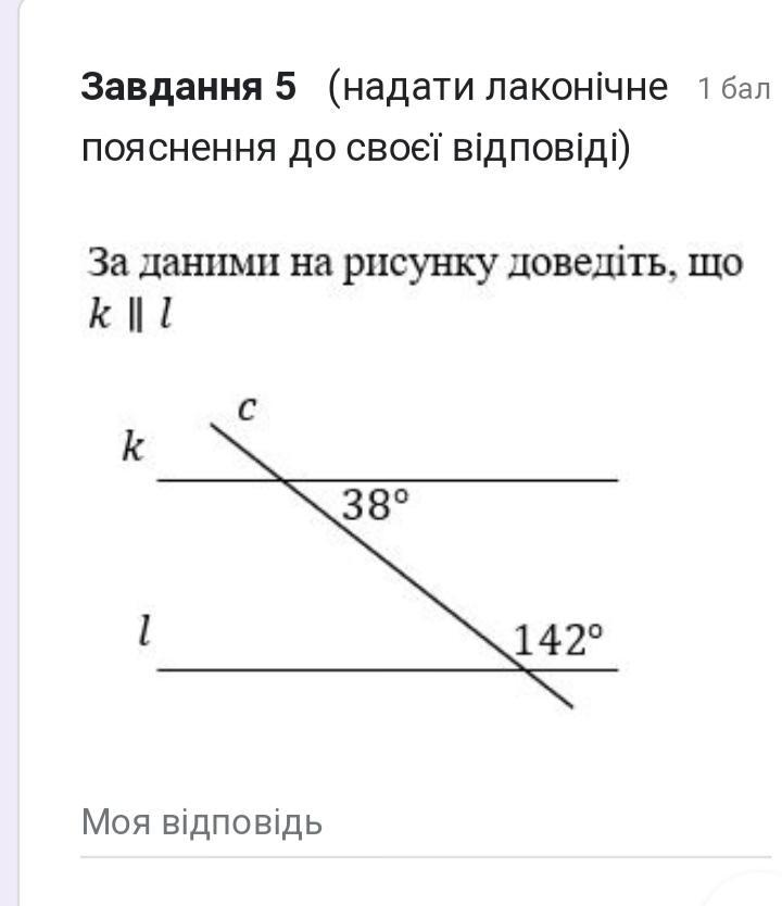 За данними малюнку ми можемо довести, чому прямі паралельні. Якщо внутрішні односторонні кути разом дають 180°, то прямі паралельні. Внутрішніми односторонніми кутами називаються кути, які лежать з одного боку від січної с між прямими а і b. У нашому випадку кути з градусними мірами 38° та 142°. Доведемо, що прямі паралельні: 142°+38°=180°.
