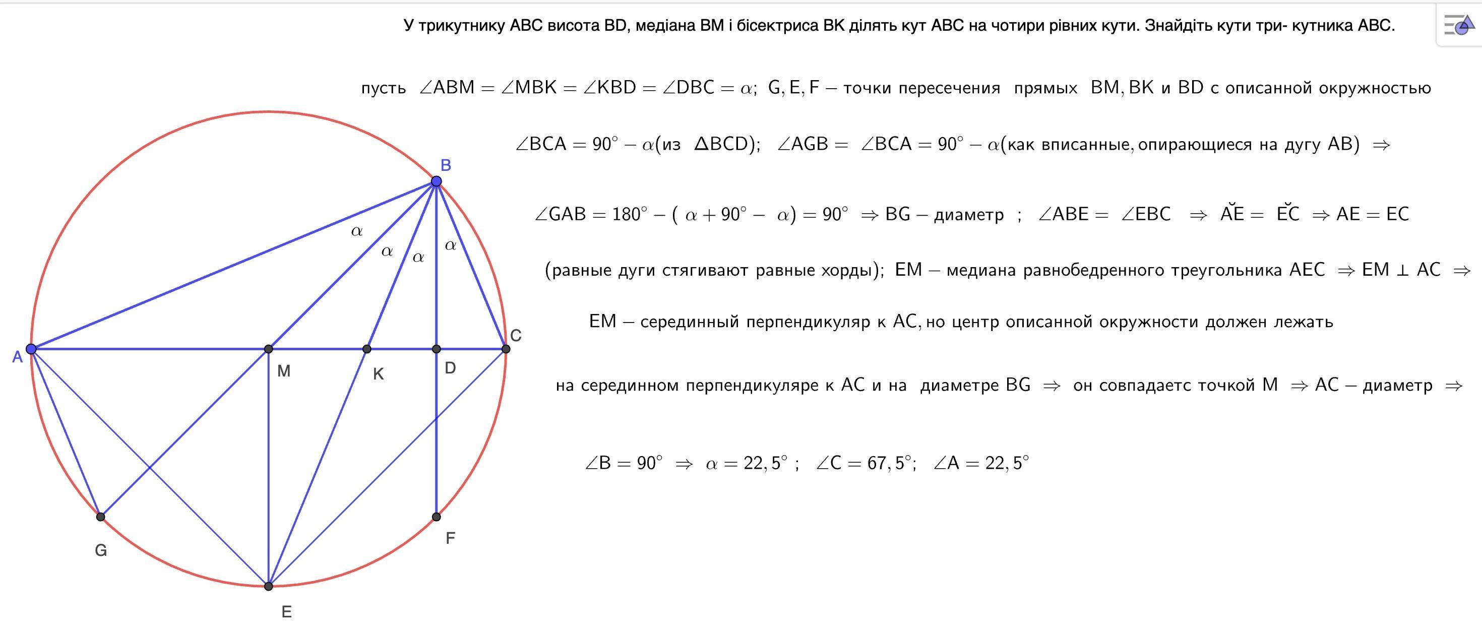 Допоможіть будь ласка! 75 балів!У трикутнику АВС висота BD, медіана ВМ і бісектриса ВК ділять кут АВС на чотири рівних кути. Знайдіть кути три- кутника АВС.