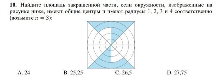 10. Найдите площадь закрашенной части, если окружности, изображенные на рисунке ниже, имеют общие центры и имеют радиусы 1, 2, 3 и 4 соответственно (возьмите = 3): A. 24 B. 25,25 C. 26,5 D. 27,75