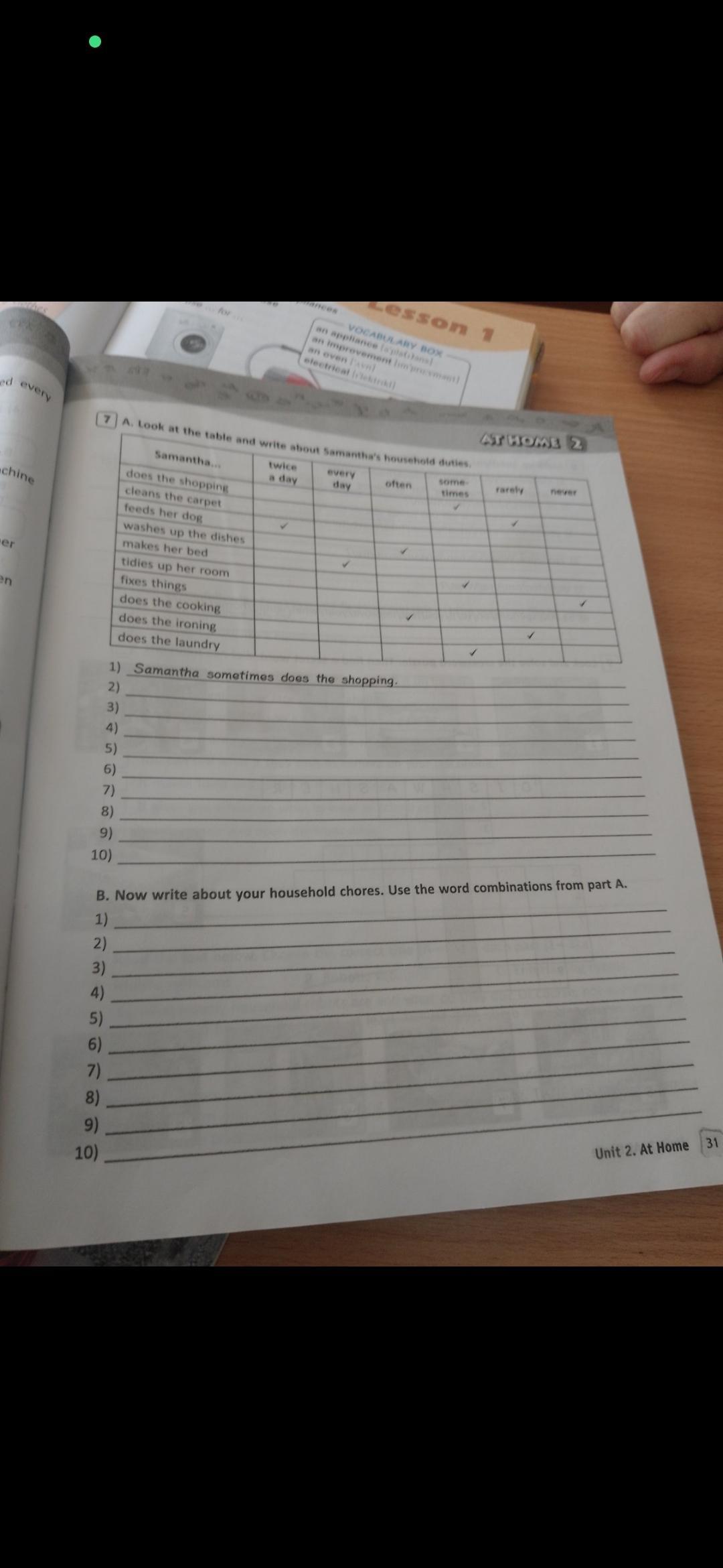 2. Samantha rarely cleans the carpet. 3. She feeds her dog twice a day. 4. She often washes up the dishes. 5. She makes her bed every day. 6. She sometimes tidies up her room. 7. She never fixes things. 8. She often does the cooking. 9. She rarely does the ironing. 10. She sometimes does the laundry..