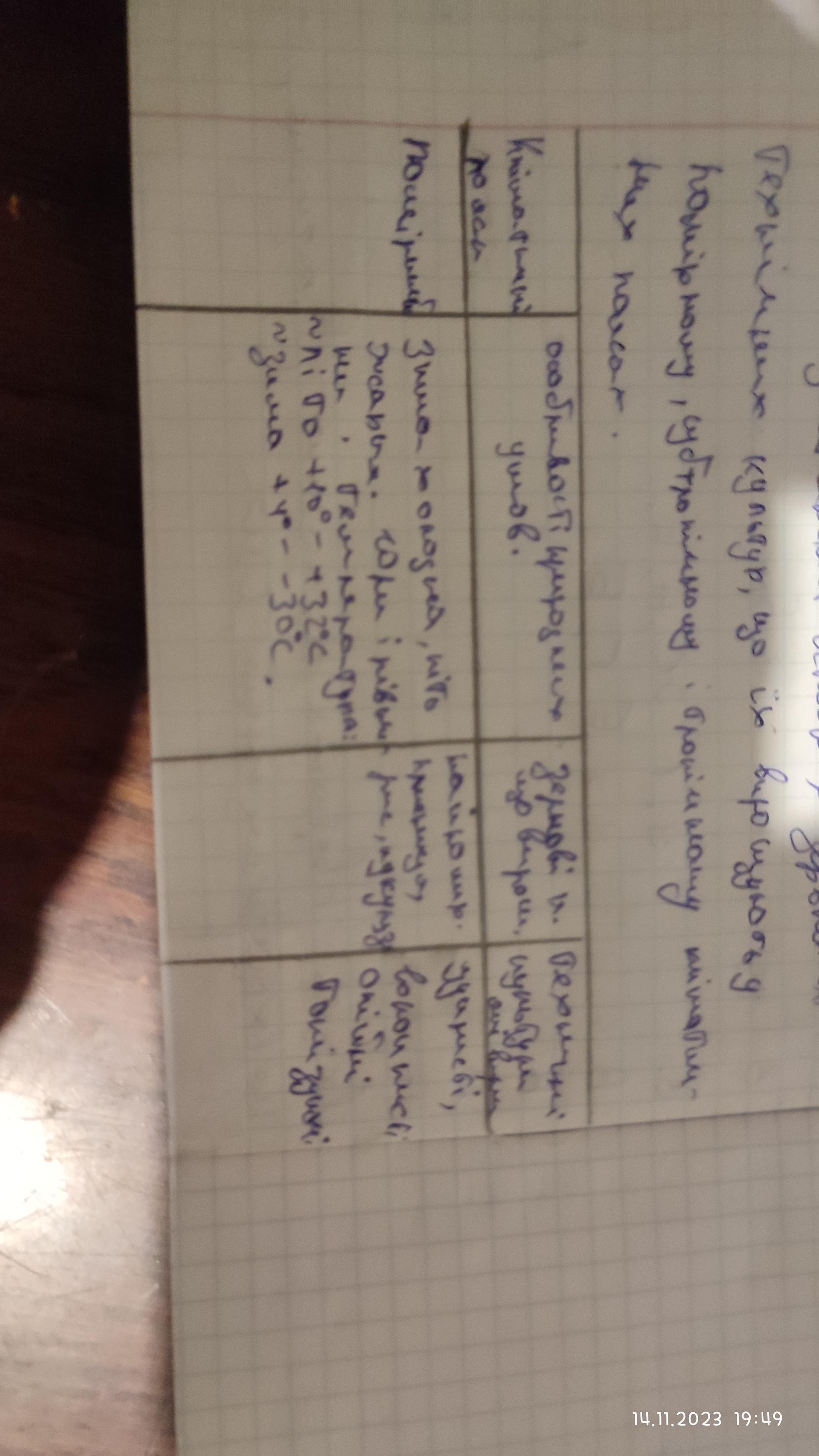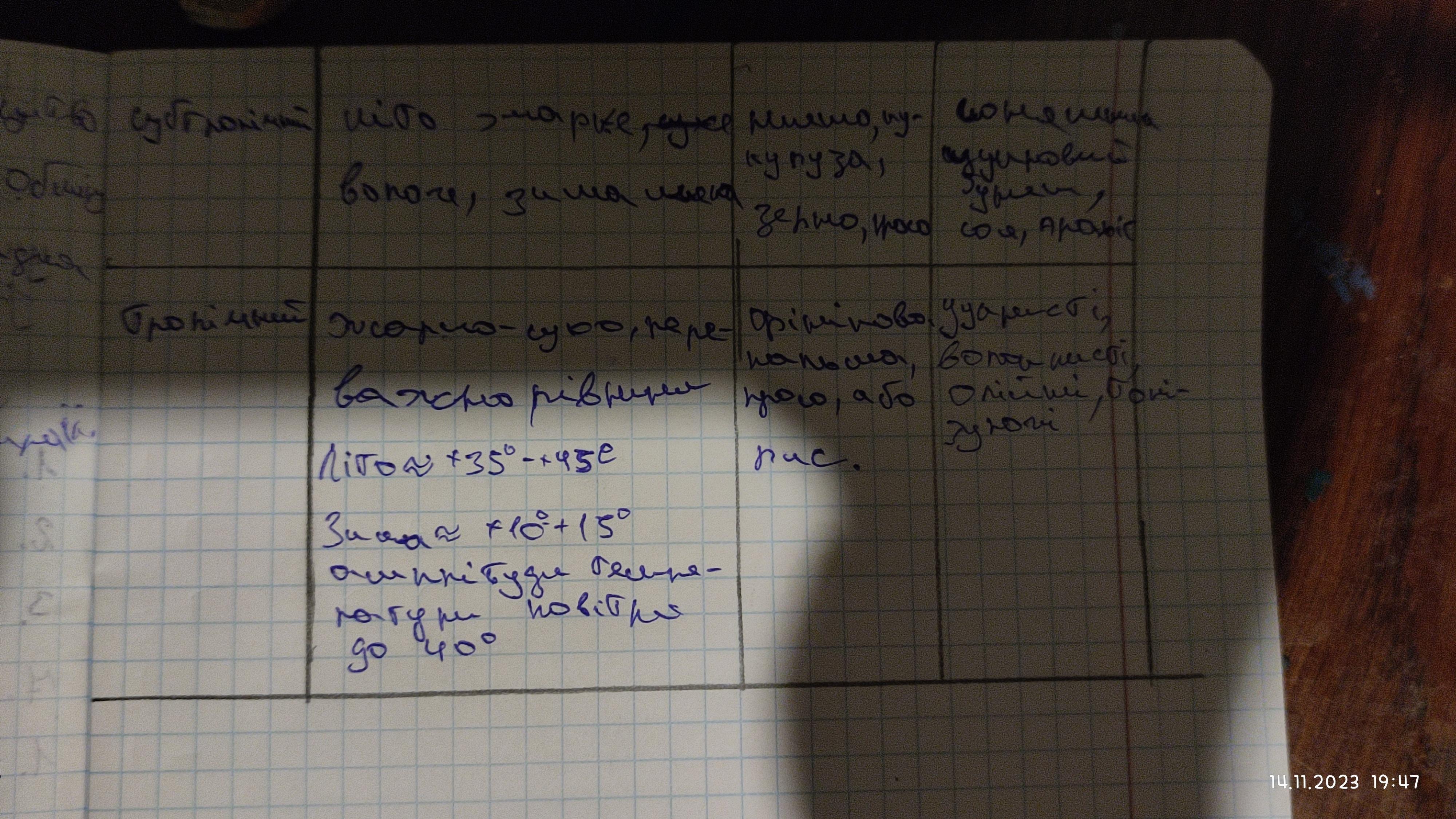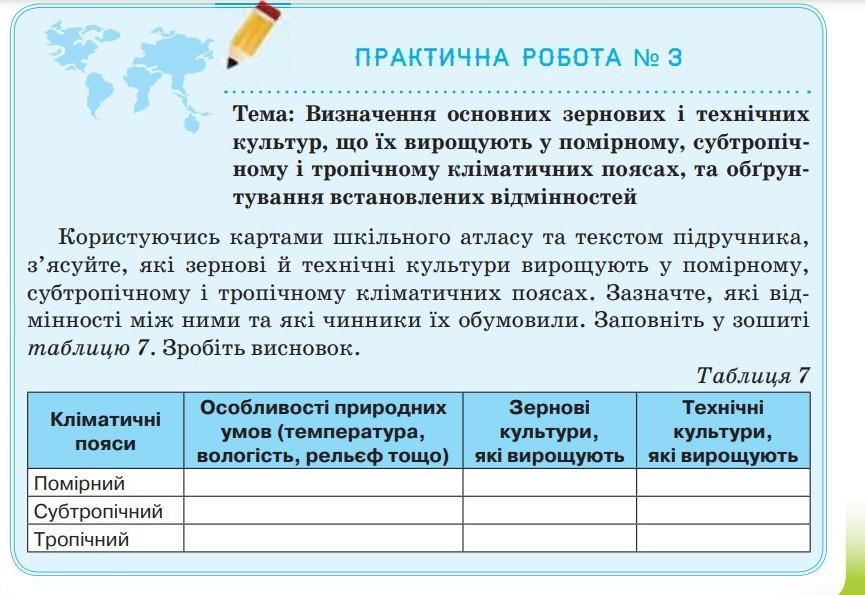 Кліматичні ПОЯСИ ПРАКТИЧНА РОБОТА № 3 Користуючись картами шкільного атласу та текстом підручника, з'ясуйте, які зернові й технічні культури вирощують у помірному, субтропічному і тропічному кліматичних поясах. Зазначте, які від- мінності між ними та які чинники їх обумовили. Заповніть у зошиті таблицю 7. Зробіть висновок. Помірний Субтропічний Тропічний Тема: Визначення основних технічних культур, що їх вирощують у помірному, субтропіч- ному і тропічному кліматичних поясах, та обґрун- тування встановлених відмінностей Особливості природних умов (температура, вологість, рельєф TOLO) Зернові культури, які вирощують Таблиця 7 Технічні культури, які вирощують