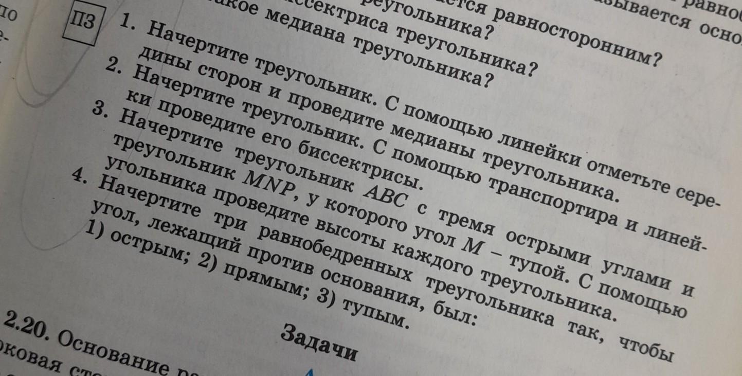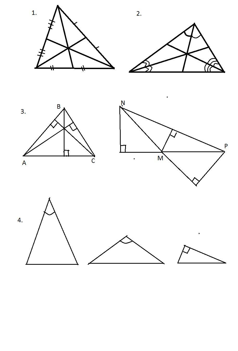 1. Начертите треугольник. С помощью линейки отметьте сере- дины сторон и проведите медианы треугольника. 2. Начертите треугольник. С помощью транспортира и линей ки проведите его биссектрисы.