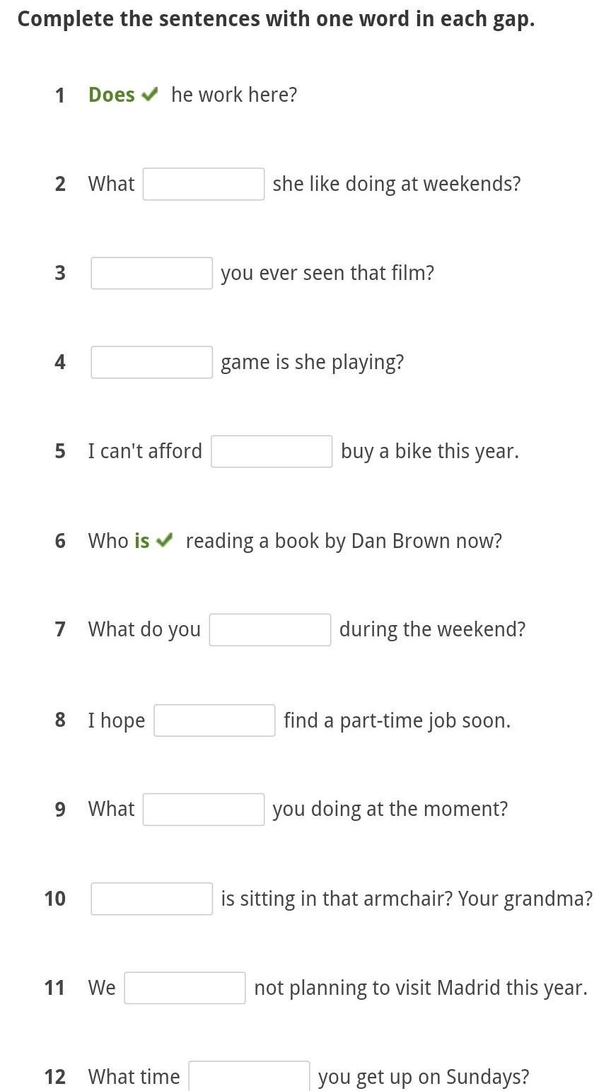 Summative Practice | Unit 1 Exercise 4 Complete the sentences with one word in each gap. 1 Does he work here? 2 What 3 5 I can't afford 7 What do you 8 I hope 9 What 10 6 Who is reading a book by Dan Brown now? she like doing at weekends? 11 We you ever seen that film? game is she playing? buy a bike this year. during the weekend? find a part-time job soon. you doing at the moment? is sitting in that armchair? Your grandma? not planning to visit Madrid this year.