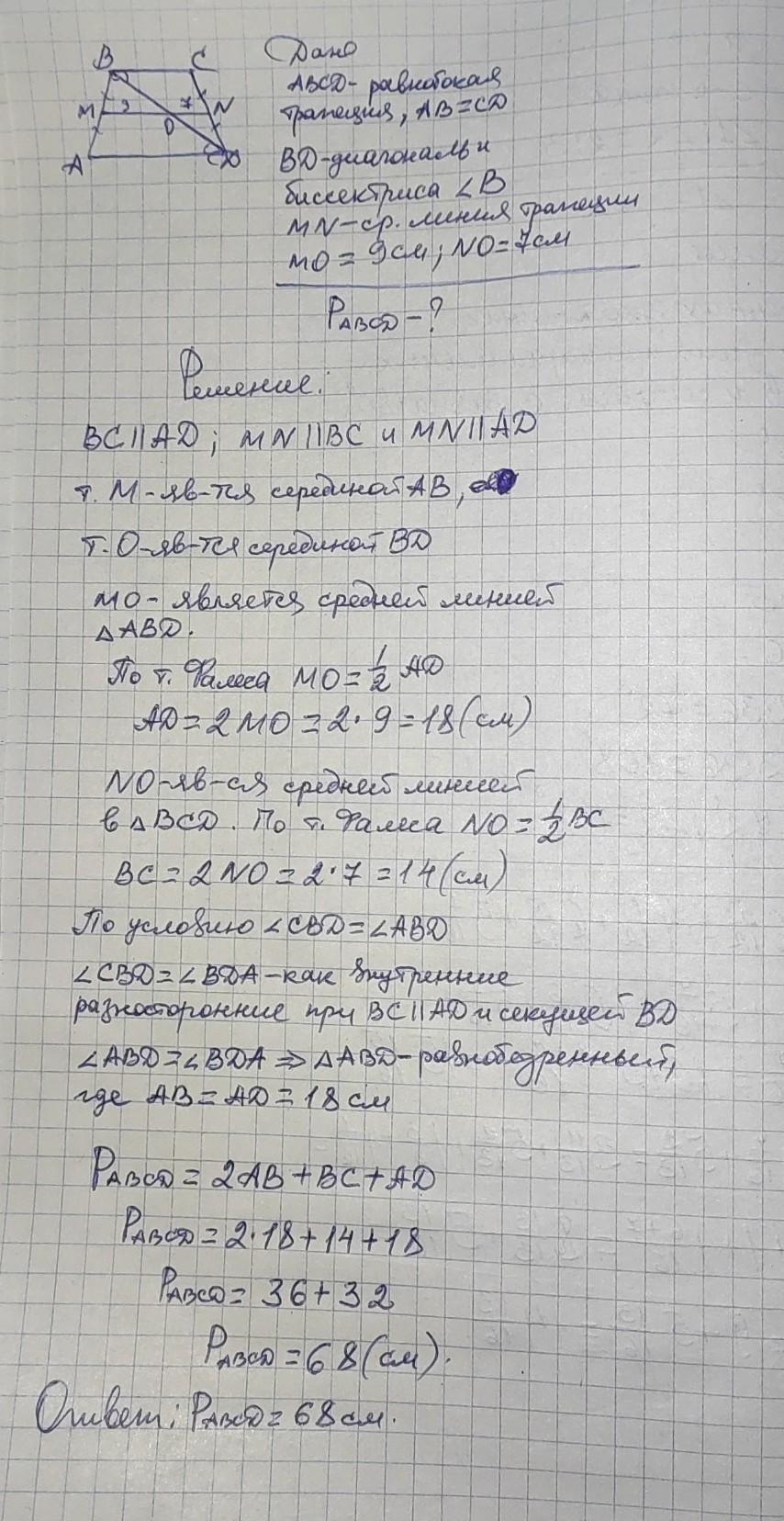 Діагональ рівнобічної трапеції ділить навпіл її тупий кут, а середню лінію - на відрізки 9 см і 7 см. Знайдіть периметр трапеції.