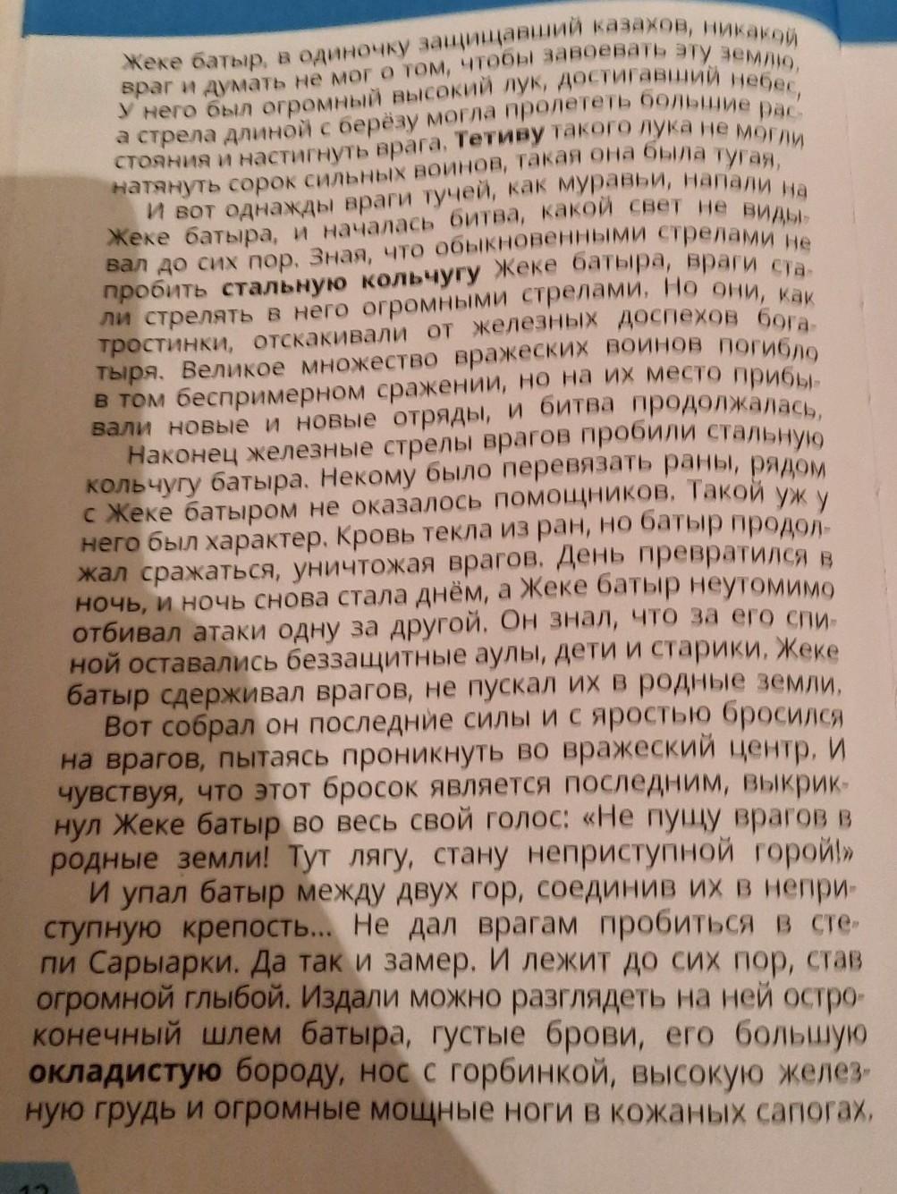 И перед смертью он понял: за счастьем нельзя ходить в одиночку, один в поле не воин. Упал батыр, посреди степи окаменел. Уснул вечным сном. Огромной горой лежит в ковыльной степи одинокий батыр, напоминая людям о дружбе, верности и единстве».
