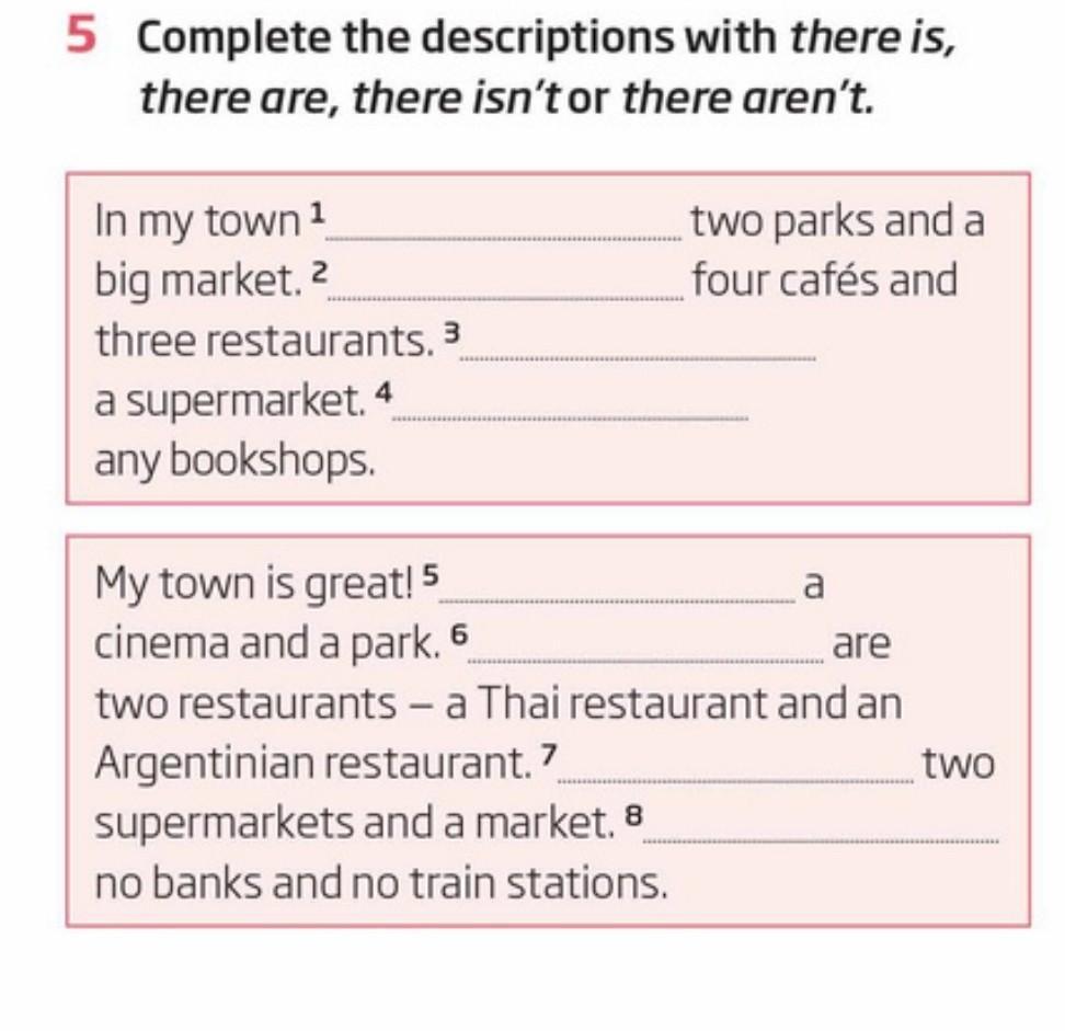 In my town ¹ big market. 2. three restaurants. 3. a supermarket. 4 . any bookshops. two parks and a four cafés and My town is great! 5 cinema and a park. 6. are two restaurants - a Thai restaurant and an Argentinian restaurant. 7 supermarkets