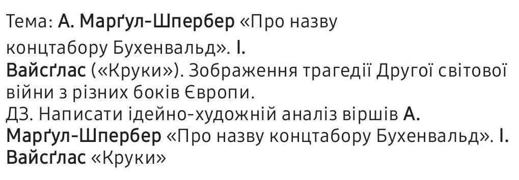 ТЕРМІНОВО БУДЬ ЛАСКА ДАМ 55 БАЛІВ Тема: А. Марґул-Шпербер «Про назву концтабору Бухенвальд». І. Вайсґлас («Круки»). Зображення трагедії Другої світової війни з різних боків Європи. ДЗ. Написати ідейно-художній аналіз віршів А. Марґул-Шпербер «Про назву концтабору Бухенвальд». І. Вайсґлас «Круки»