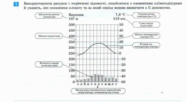 1 Використовуючи рисунок і теоретичні відомостi, ознайомтеся з елементами кліматодіаграми й укажіть, якi показники клімату та за який період можна визначити з її допомогою.