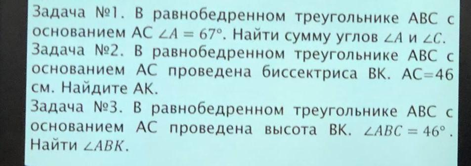 3) Так как в равнобедренном треугольнике высота также является бисектрисой она делит угл из которого выходит на равные углы.<АВК=46÷2=23°