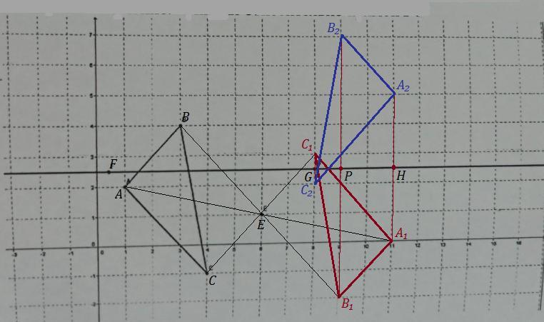 выполните последовательно симметрию относительно точки Е, а затем симметрию полученной фигуры относительно прямой FG