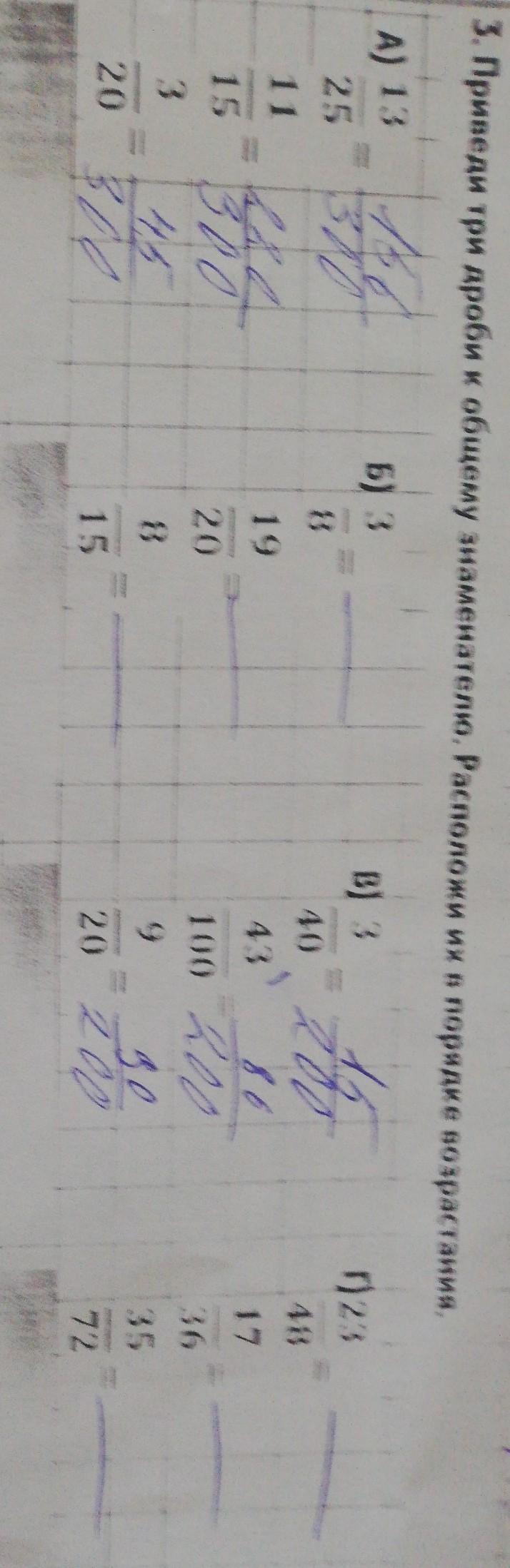 3. Приведи три дроби к общему знаменателю. Расположи их в порядке возрастания. 166 310 А A) 13 25 11 15 кад 300 4,5 20 301 3 Б) 3 8 19 20 8 15 B) 3 15 = 40 200 86 100 200 43 9 до 20 200 Г)23 48 17 36 35 72