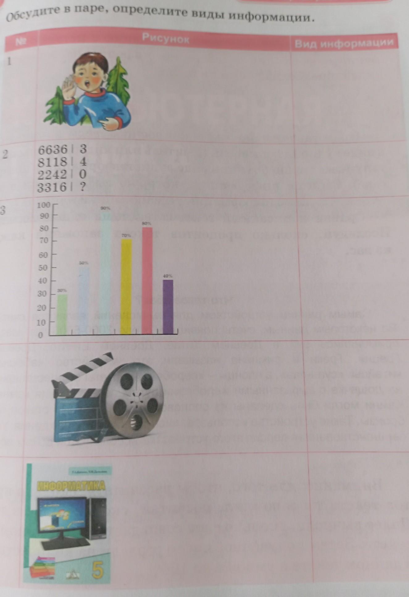 1. звуковий 2.цифровий .3 табличний 4видео информація 5.буквенна