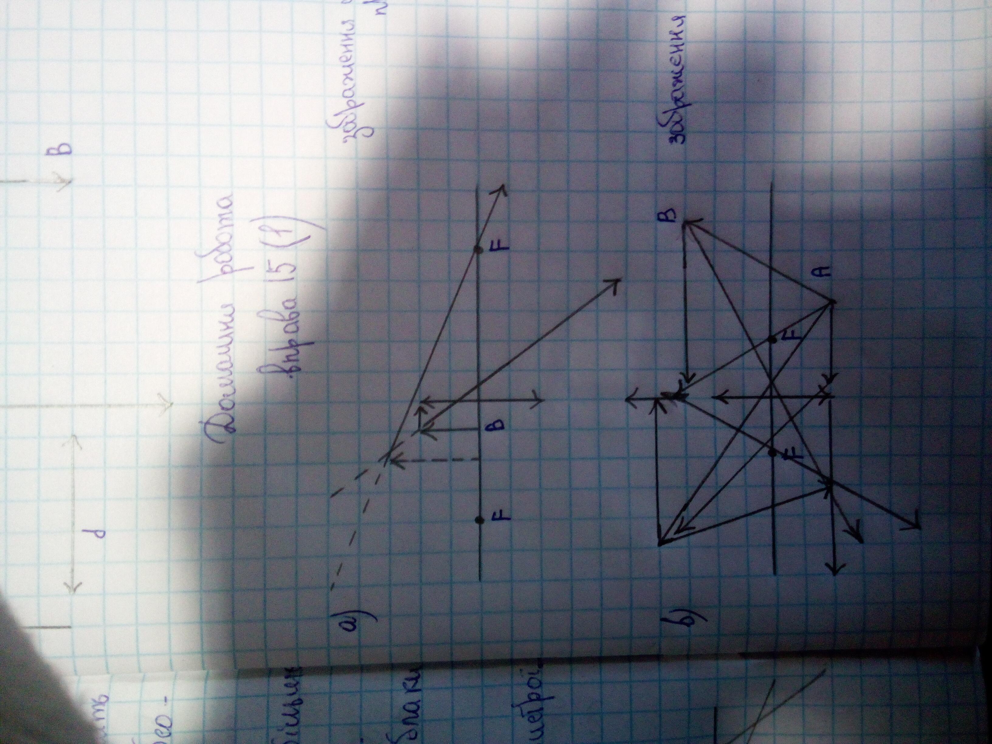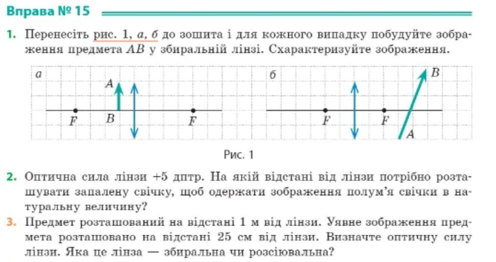 Вправа № 15 1. Перенесіть рис. 1, а, 6 до зошита i для кожного випадку побудуйте зобра- ження предмета АВ у збиральній лінзi. Схарактеризуйте зображення. а F в б B Рис. 1 2. Оптична сила лiнзи +5 дптр. На як відстані від лінзи потрібно розта- шувати запалену свічку, щоб одержати зображення полум'я свічки в на- туральну величину, 3. Предмет розташований на відстані 1 м від лінзи. Уявне зображення пред- мета розташовано на відстані 25 см від лінзи. Визначте оптичну силу лінзи. Яка це лінза збиральна чи розсіювальна?