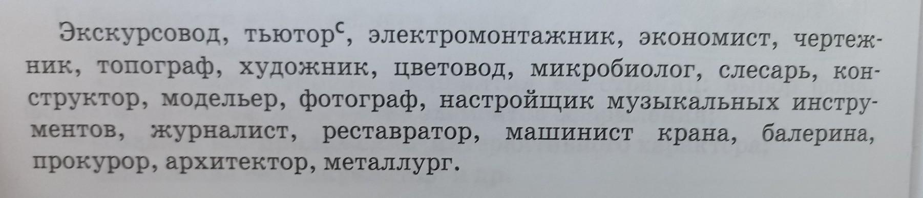 Экскурсовод объясняет детям правила во время экскурсии. Будущий тьютор учится в вузе. Я проработала несколько месяцев электромонтажником. Моя знакомая-отличная экономистка. Чертёжник. Мужчина искал вакансию на чертёжника. Дядя топограф рассказывал истории со своей работы. Юная художница рисует картину на заказ. Цветовод оставил этот вид цветов не для продажи, а для души. Первый микробиолог Луи Пастер придумал микробиологию. Слесари работали целый день. Конструктор сильно заболел и остался дома. Модельер стал настолько популярным, что у него стали одеваться знаменитости. Фотограф выбирает удачный ракурс модели чтобы фотография на обложку получилась красивой. Опытный настройщик настраивал музыкальный инструмент. Журналист спросил свидетеля про аварию. Реставратор много работал по этой области. Знакомый заменял машиниста крана. Чтобы стать балериной нужно упорно трудиться с самого детства. Школьник заинтересовался проффесией прокурор. Мои родители наняли архитектора. Мой папа работает металлургом