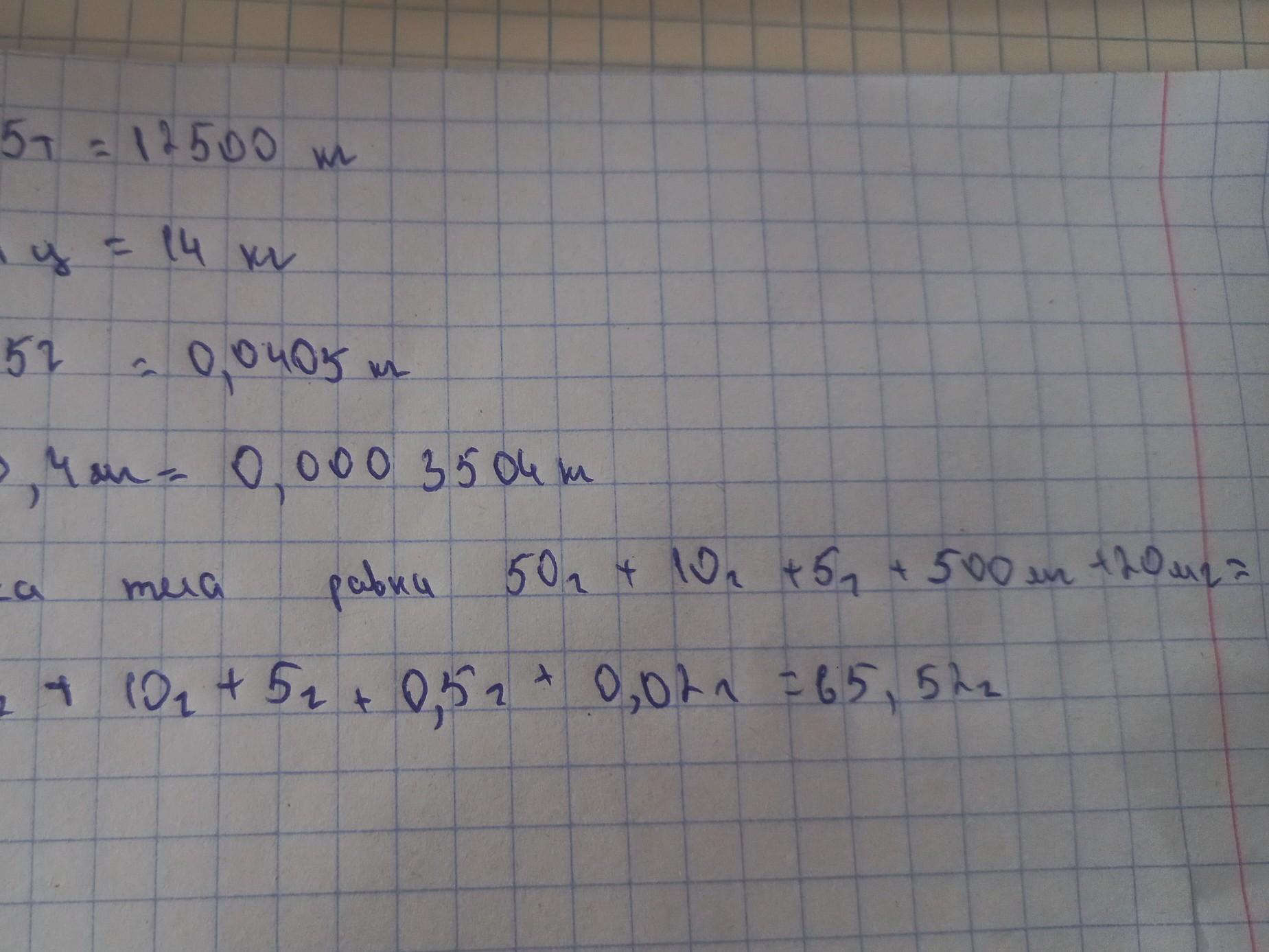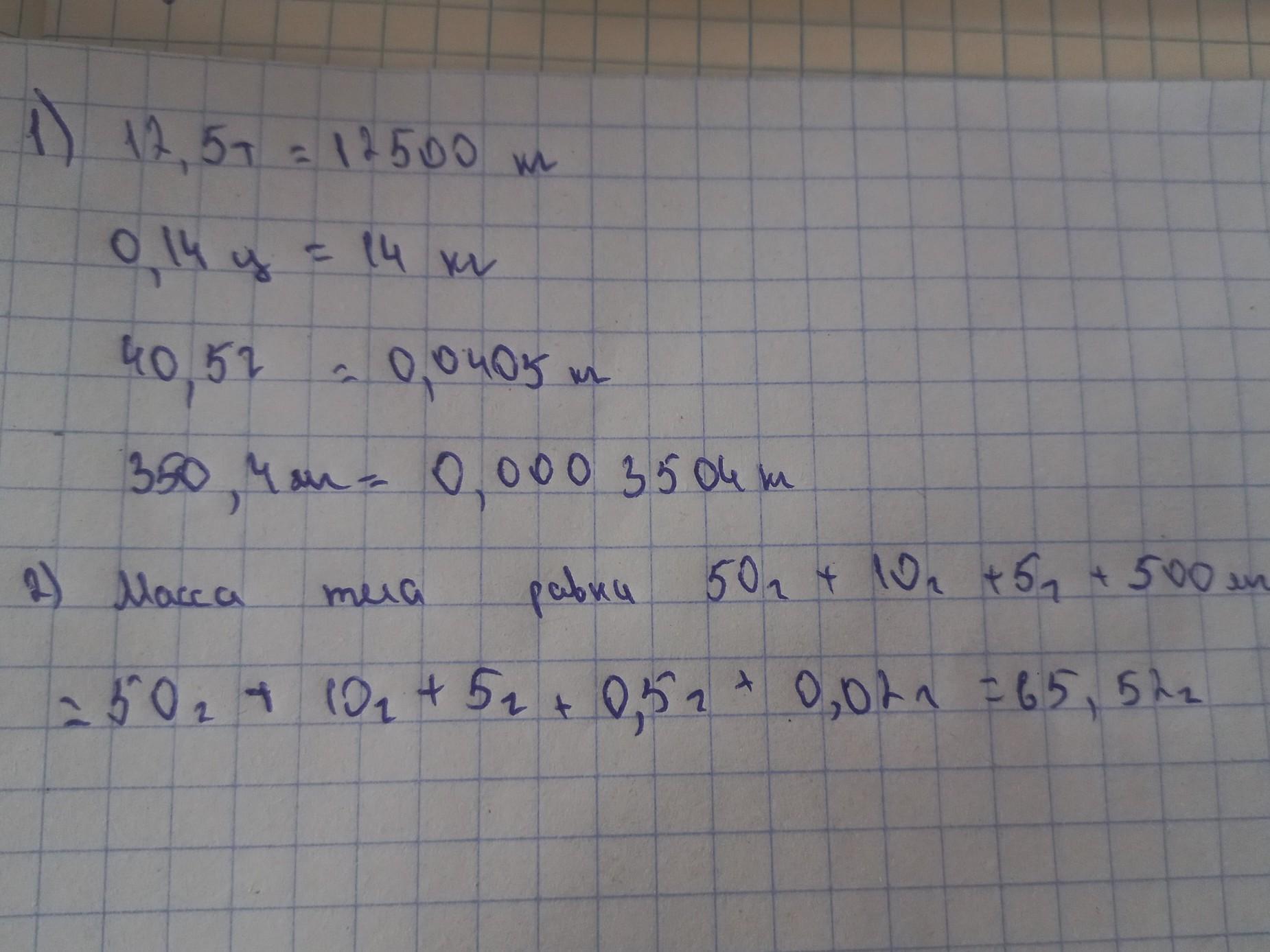 1. Выразите в килограммах массы тел: 12,5 т; 0,14 ц; 40,5 г; 350,4 мг.