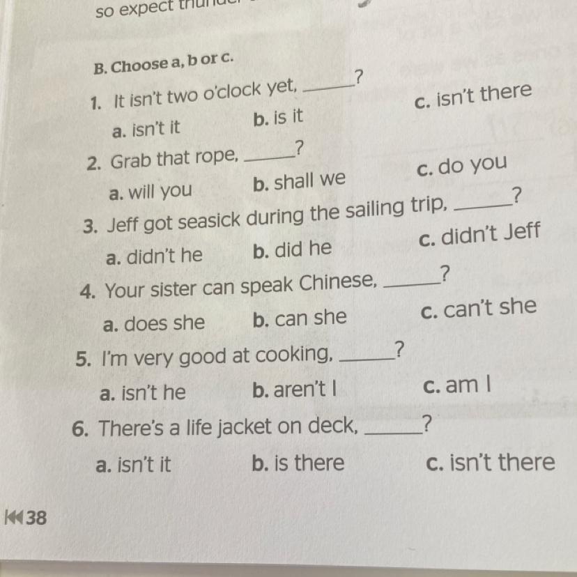 1. a. isn't it 2. a. will you 3. b. did he 4. c. can't she 5. c. am 6. b. is there