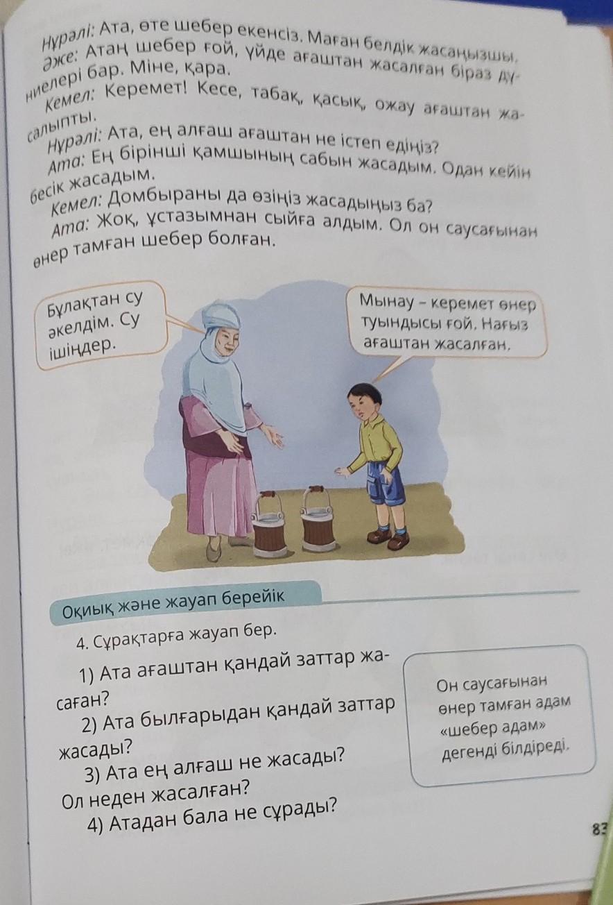 Окиык және жауап берейік 4. Сұрақтарға жауап бер. 1) Ата ағаштан қандай заттар жа- саған? 2) Ата былғарыдан қандай заттар жасады? 3) Ата ең алғаш не жасады? Ол неден жасалған? 4) Атадан бала не сұрады? Он саусағынан өнер тамған адам «шебер адам>> дегенді білдіреді.