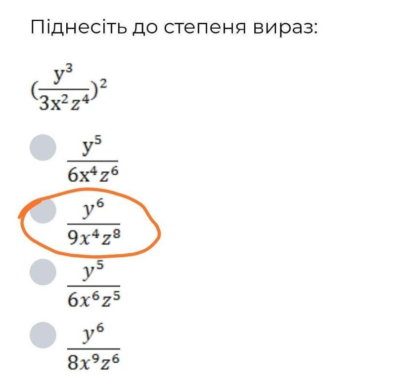 (у³/3х²z⁴)² = ( (y³)²)/( (3x²z⁴)² ) = y⁶/(9x⁴z⁸)