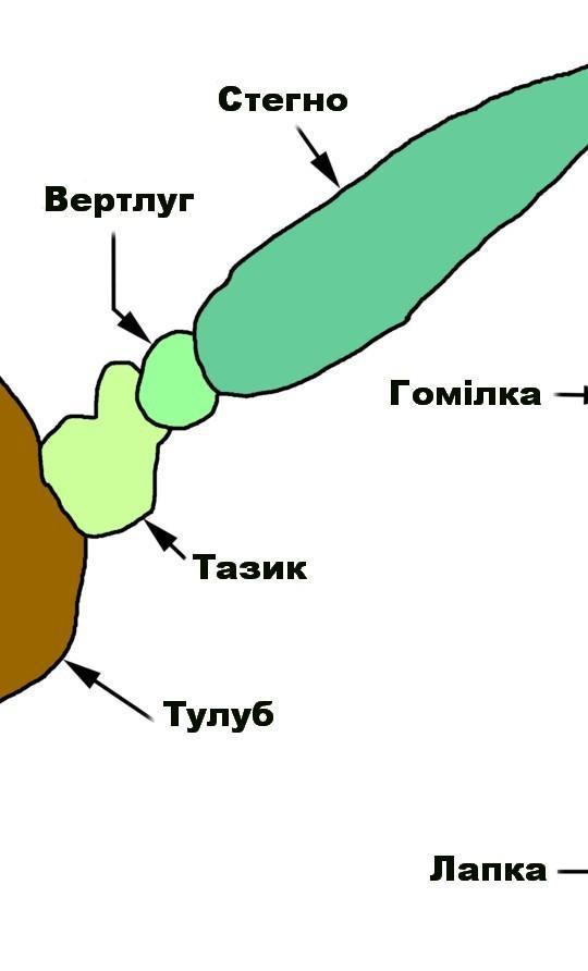Вертлуг,Стегно,гомілка,тазик,тулуб,лапка.