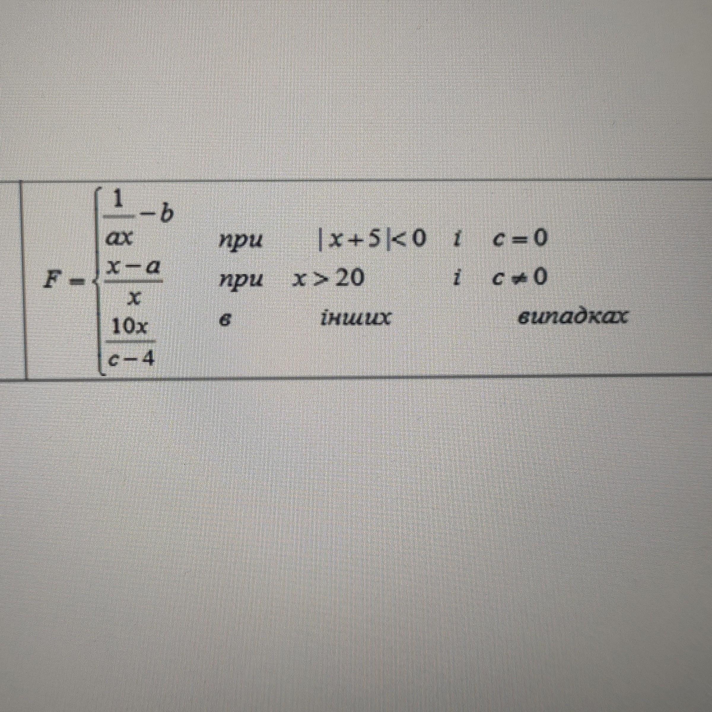 Обчислити і вивести на екран у вигляді таблиці значення функції F на інтервалі від хпоч. до хкінц. з кроком Δх. Значення a, b, c, хпоч., хкінц., Δх ввести з клавіатури. В мові програмування C++