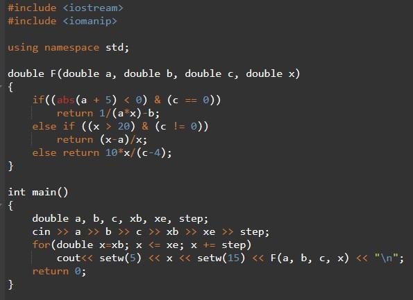 cout<< setw(5) << x << setw(15) << F(a, b, c, x) << "\n";